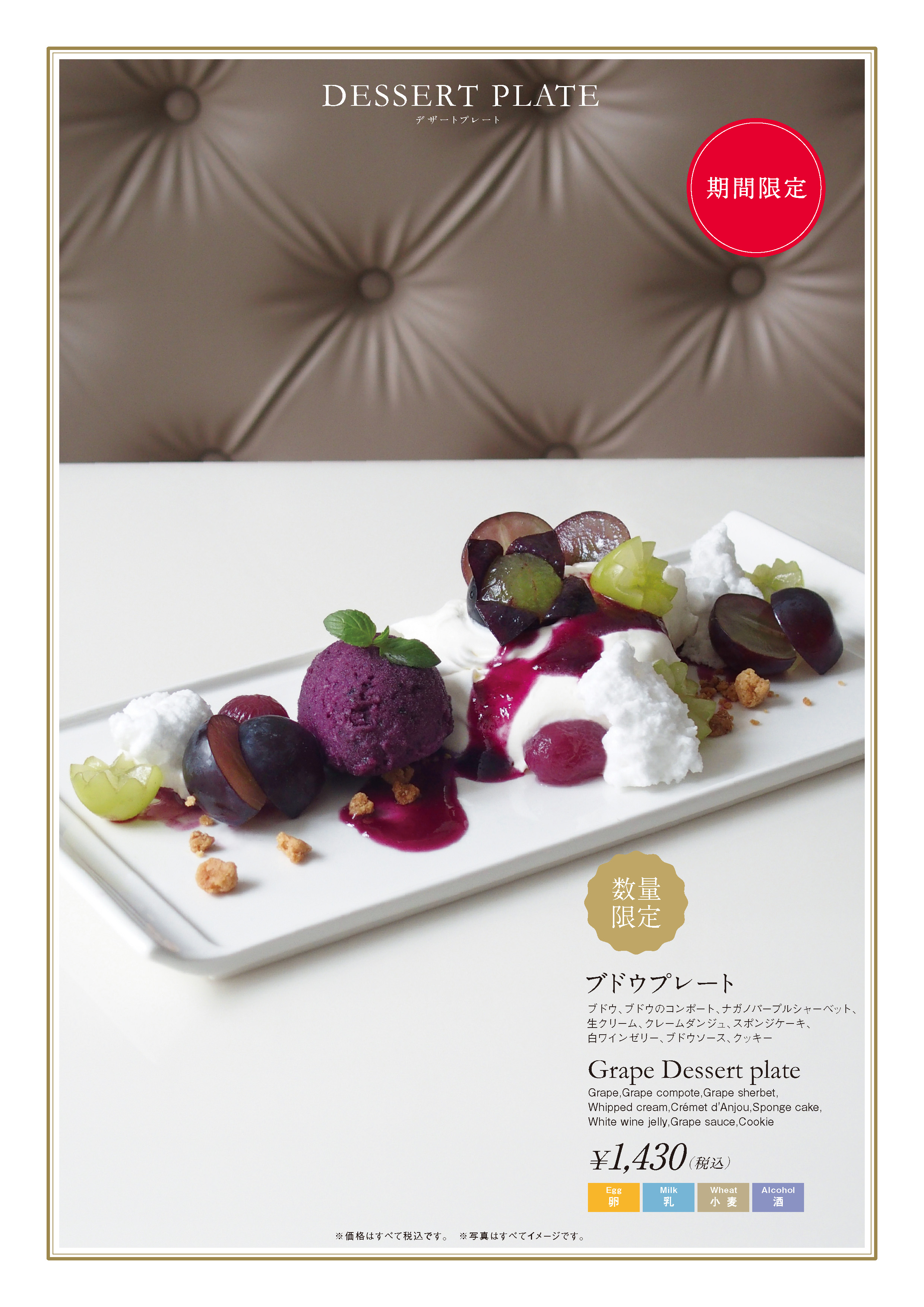・内容:ブドウ、ブドウのコンポート、ナガノパープルシャーベット、生クリーム、クレームダンジュ、スポンジケーキ、白ワインゼリー、ブドウソース、クッキー