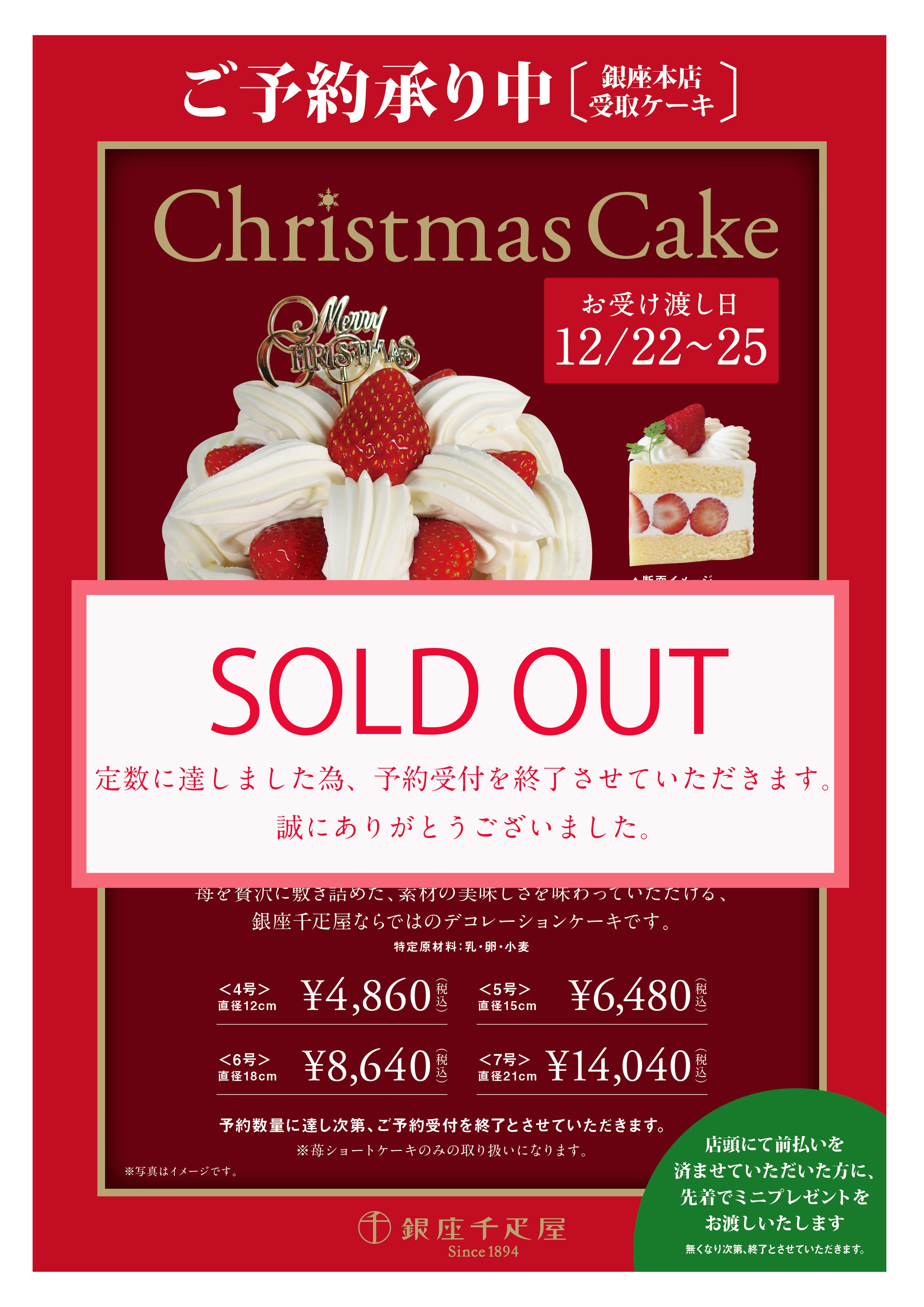 《銀座本店・新宿店》Xmas"苺ショートケーキ"予約受付中