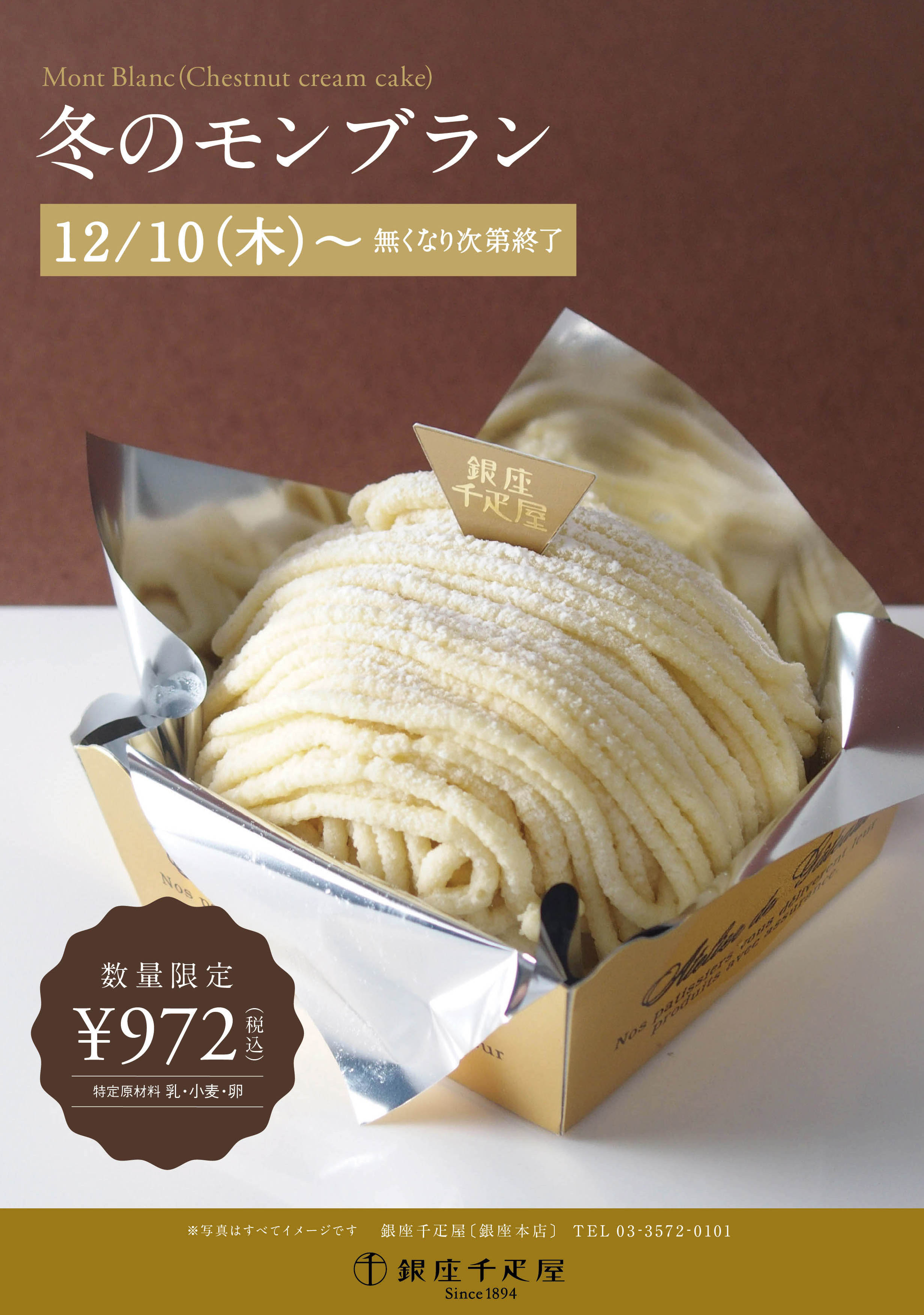 銀座千疋屋・パティスリー銀座千疋屋では、2020年12月10日(木)より、数量限定にて”冬のモンブラン”を販売いたします。
