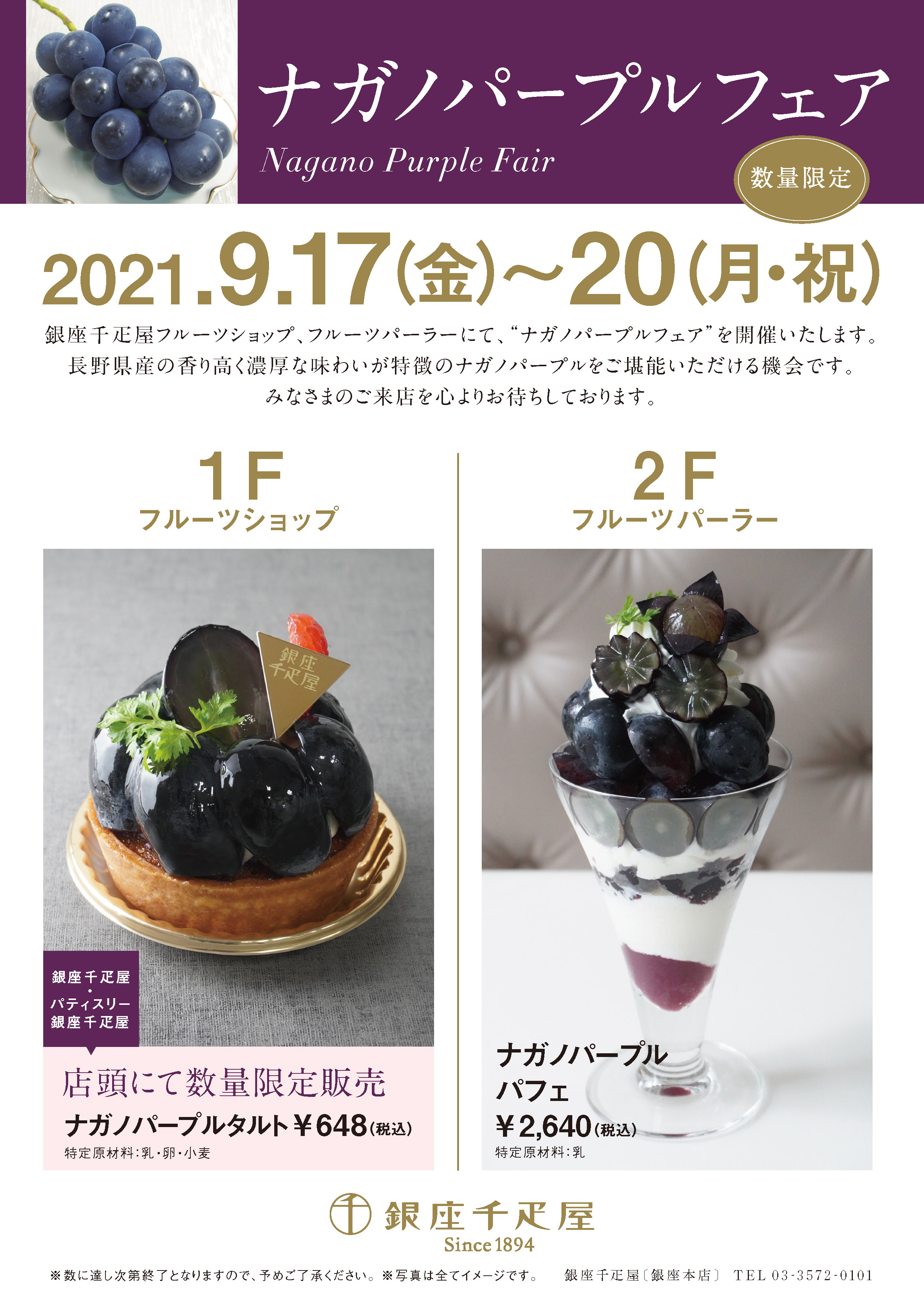 銀座千疋屋・パティスリー銀座千疋屋では、2021年9月17日(金)〜2021年9月20日(月・祝)の4日間に渡り、長野県産 ナガノパープルフェアを開催させていただきます。