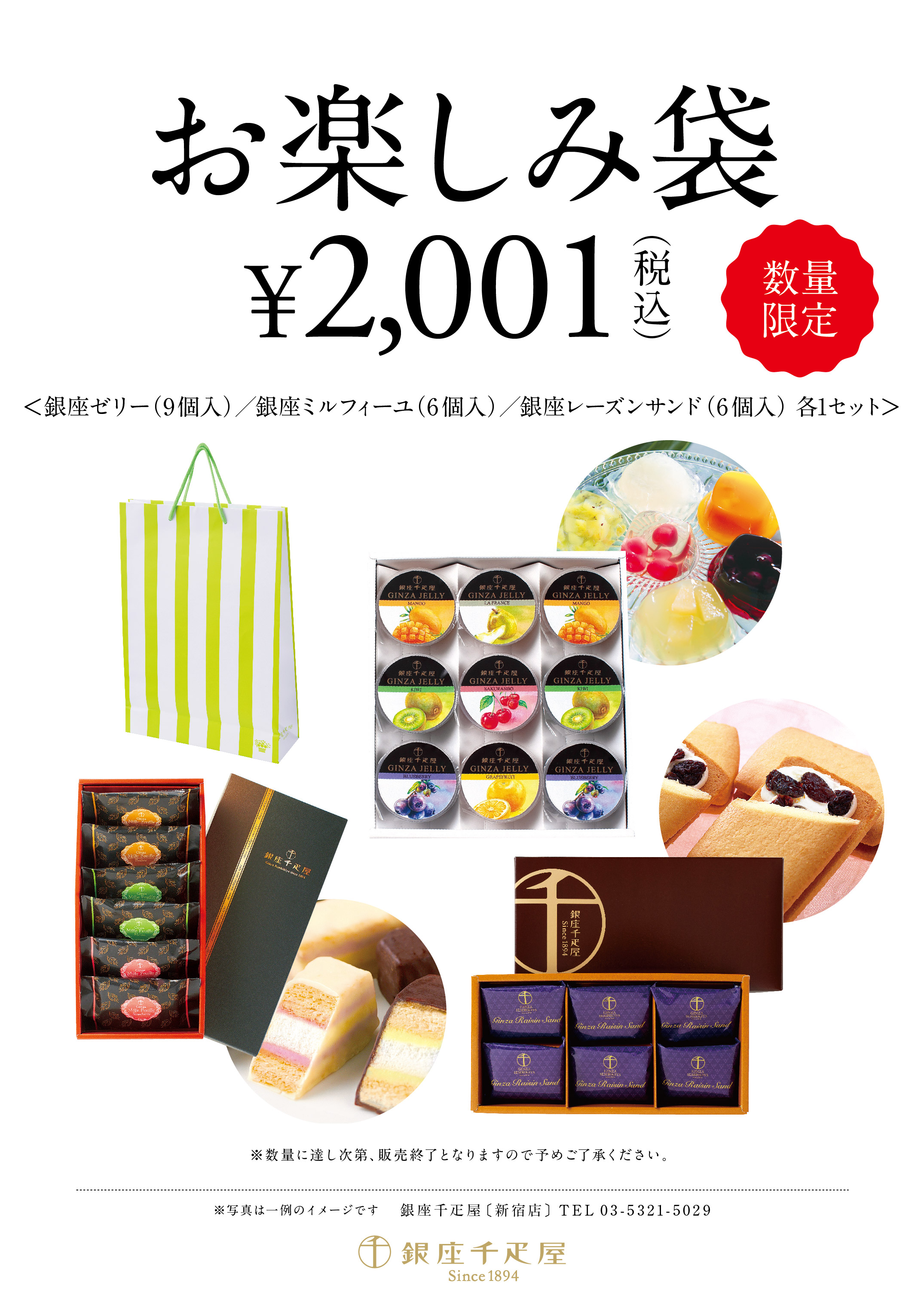 銀座千疋屋 新宿店(京王百貨店・のれん街)は、2022年1月2日(日)より数量限定にて”お楽しみ袋”を販売いたします。
