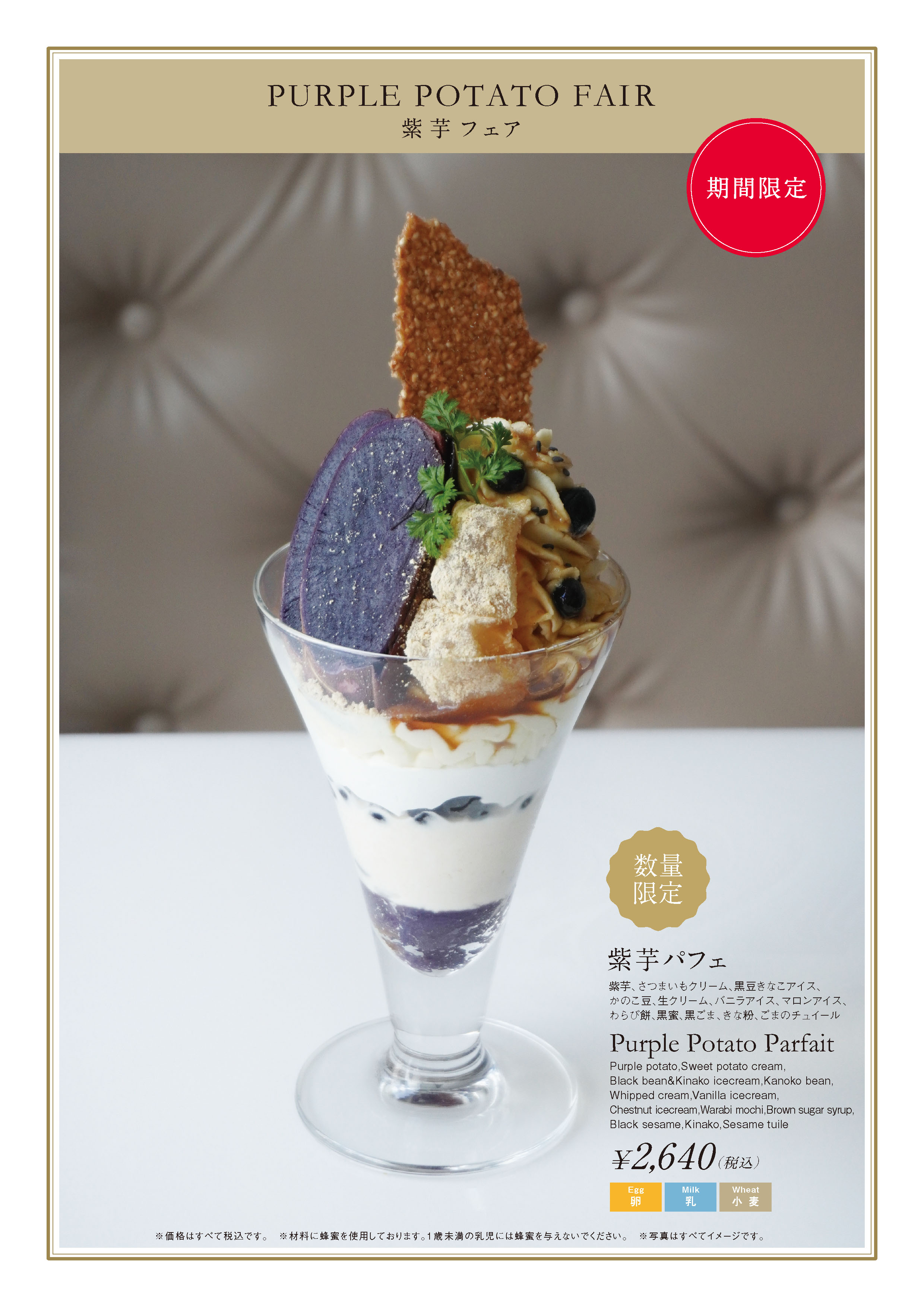・内容:紫芋(さつまいも)、さつまいもクリーム、黒豆きなこアイス、かのこ豆、生クリーム、バニラアイス、マロンアイス、わらび餅、黒蜜、黒ごま、きな粉、ごまのチュイール