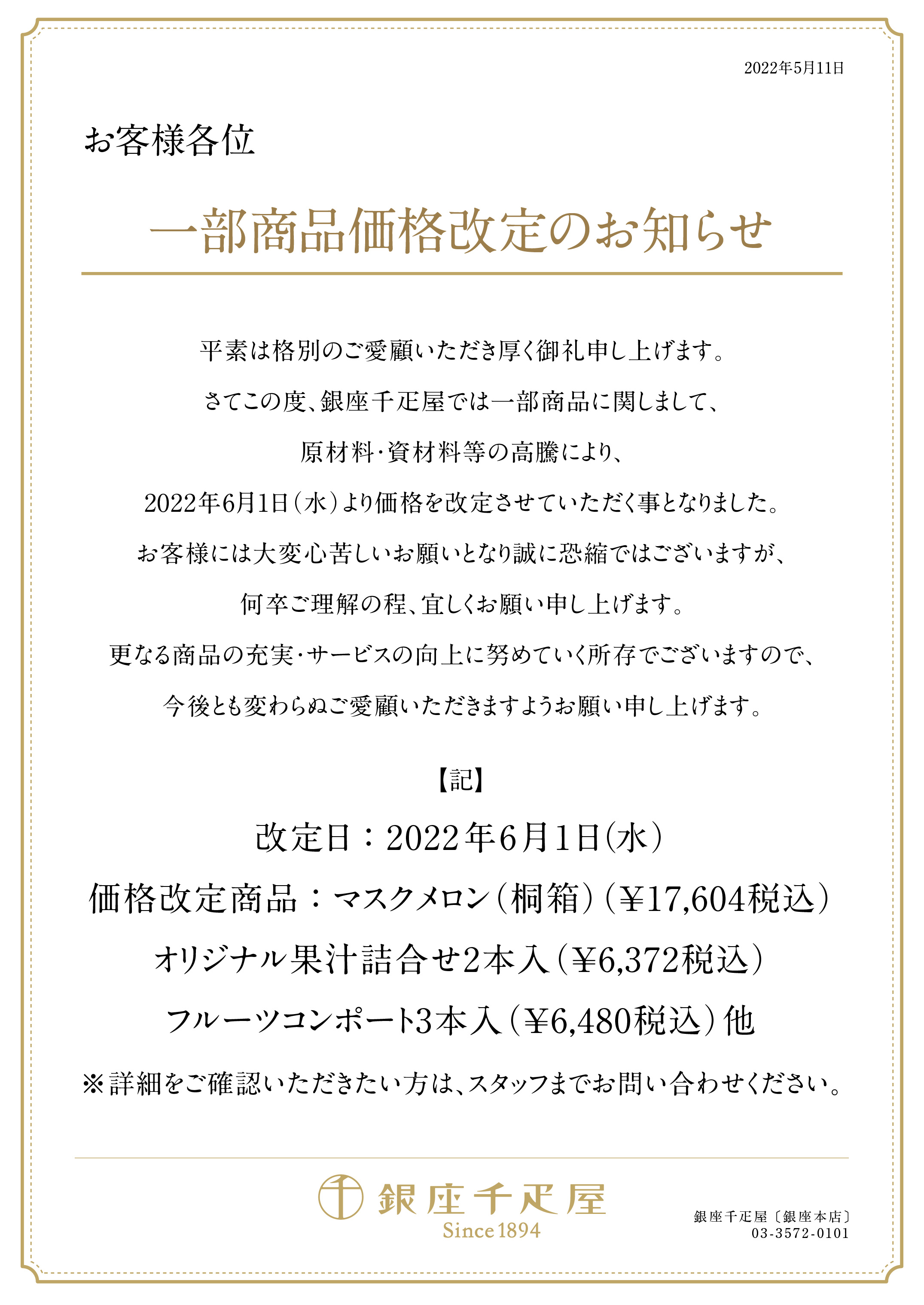 さてこの度、銀座千疋屋では一部商品に関しまして、原材料・資材料等の高騰により、2022年6月1日(水)より価格を改定させていただく事となりました。