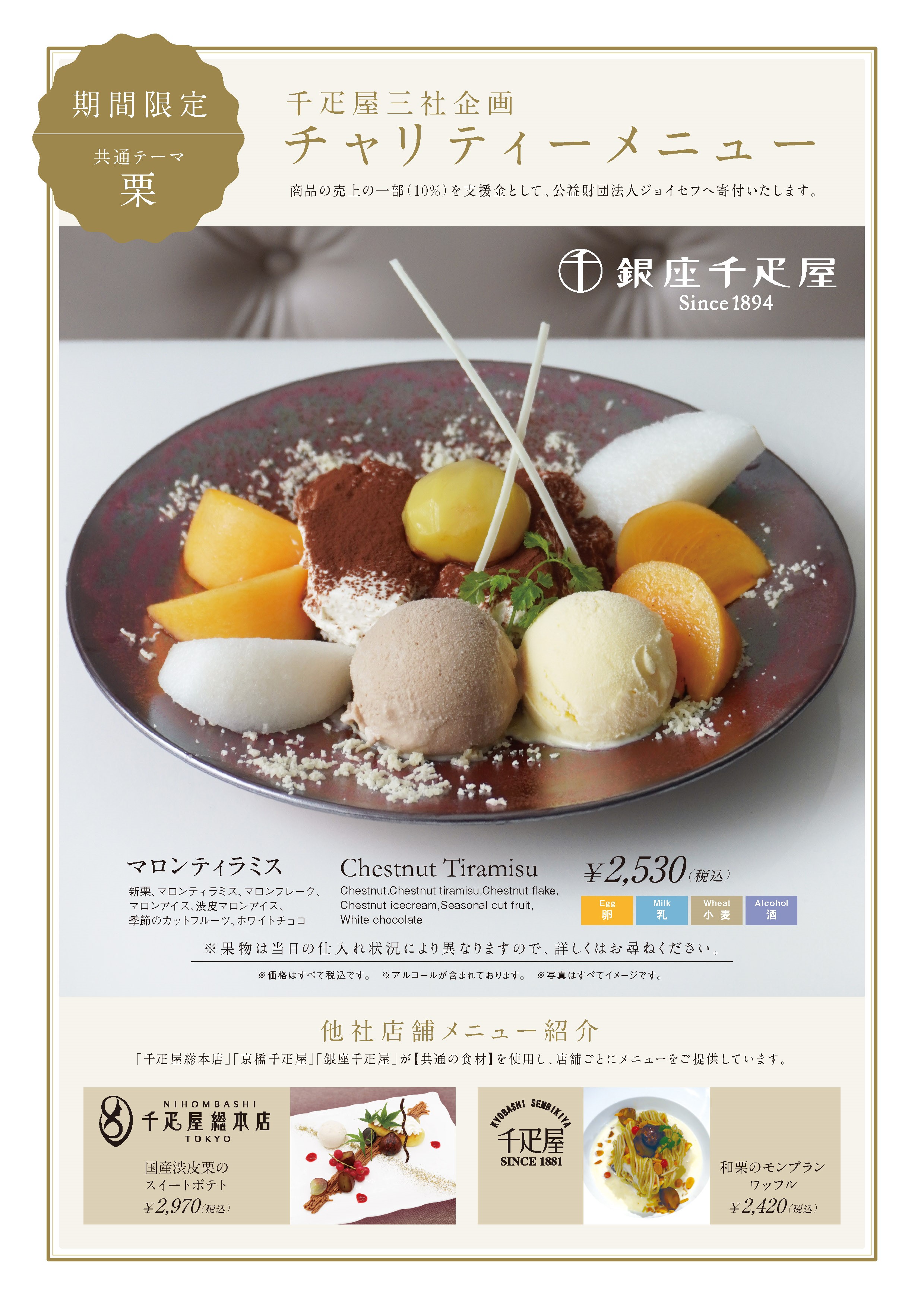 銀座千疋屋 銀座本店フルーツパーラーでは、「千疋屋総本店」・「京橋千疋屋」・「銀座千疋屋」三社共同で、チャリティーメニューを企画しています。