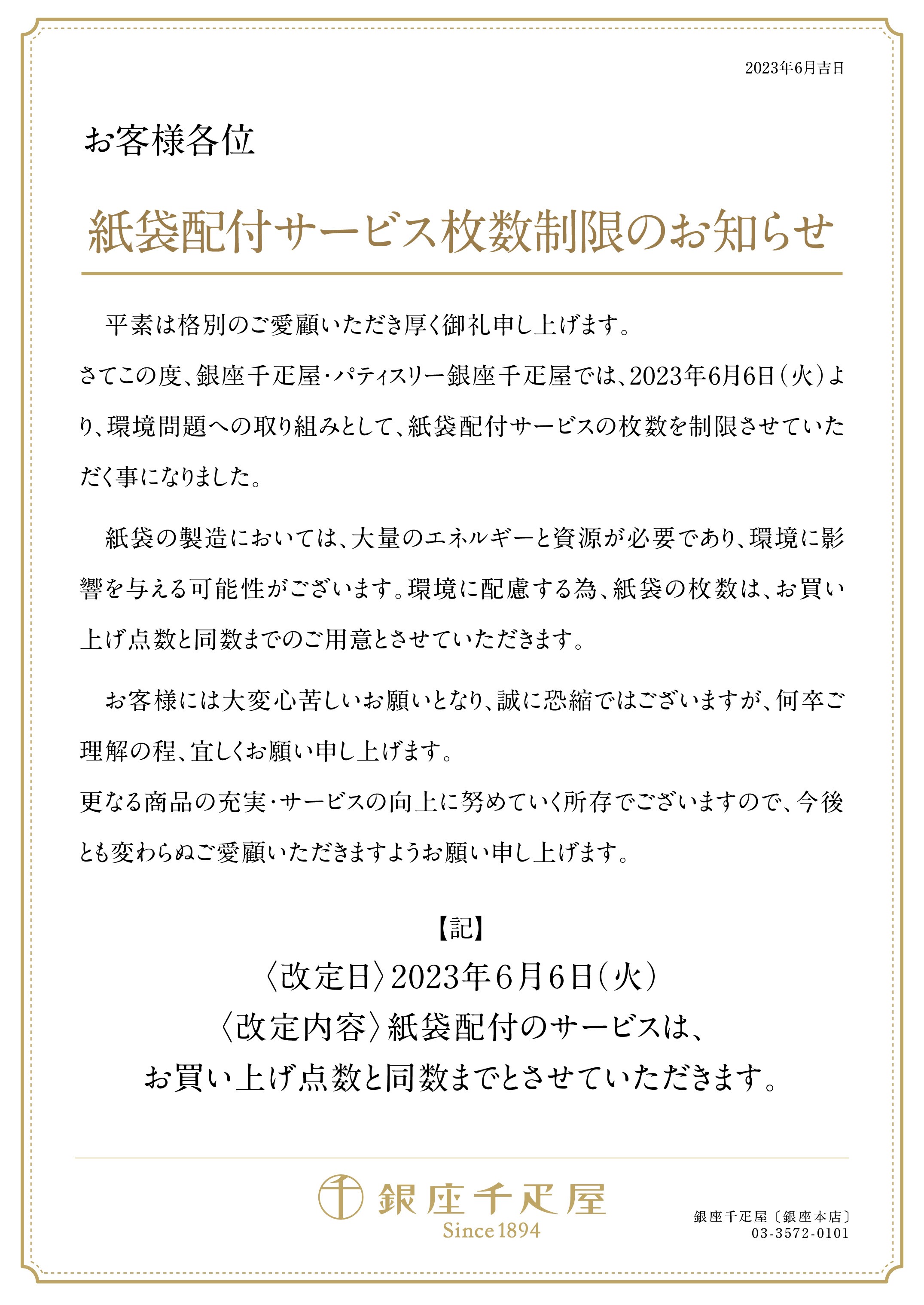 さてこの度、銀座千疋屋・パティスリー銀座千疋屋では、2023年6月6日(火)より、環境問題への取り組みとして、紙袋配付サービスの枚数を制限させていただく事になりました。