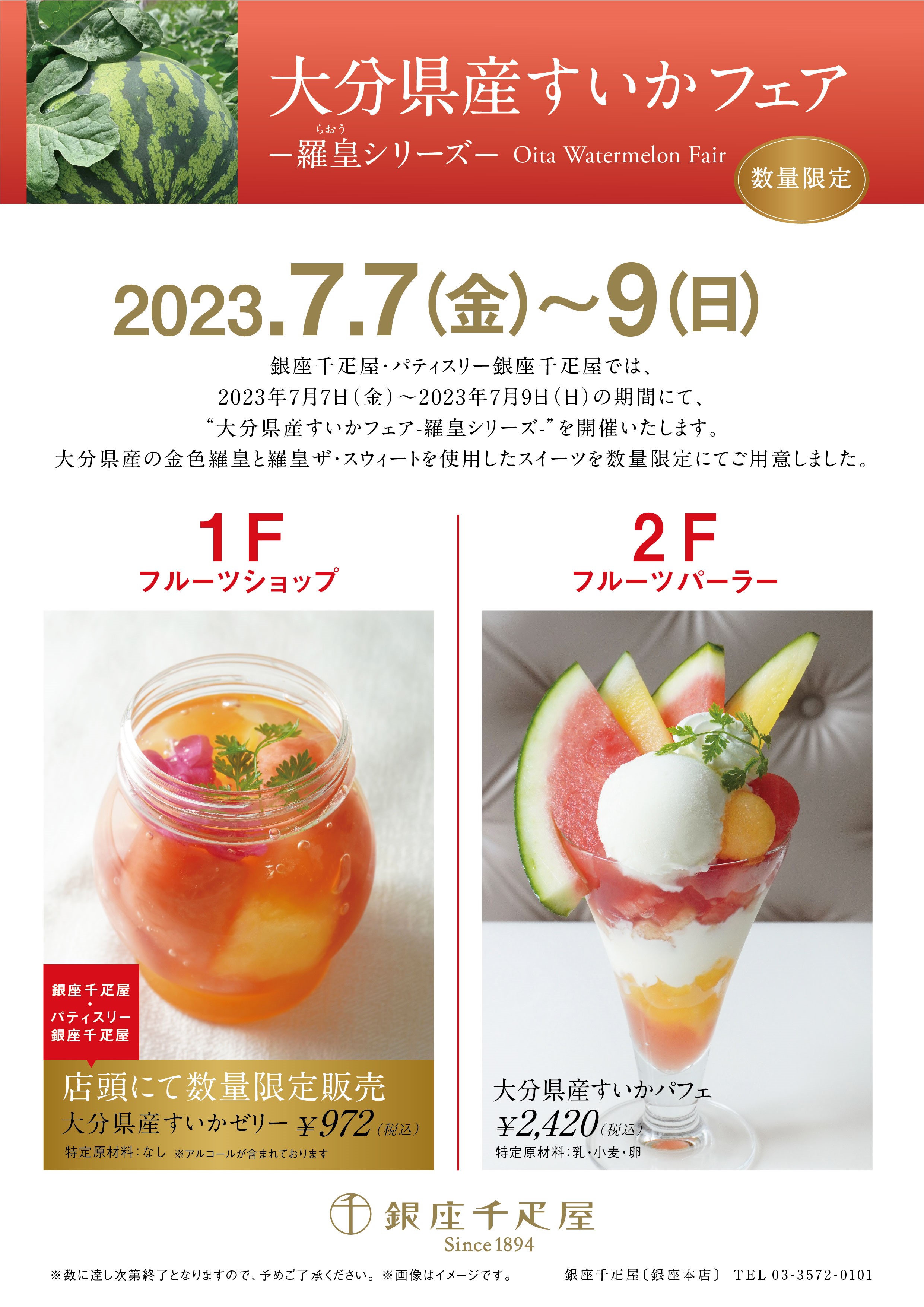 銀座千疋屋・パティスリー銀座千疋屋では、2023年7月7日(金)~2023年7月9日(日)の期間にて、“大分県産すいかフェア-羅皇シリーズ-”を開催いたします。