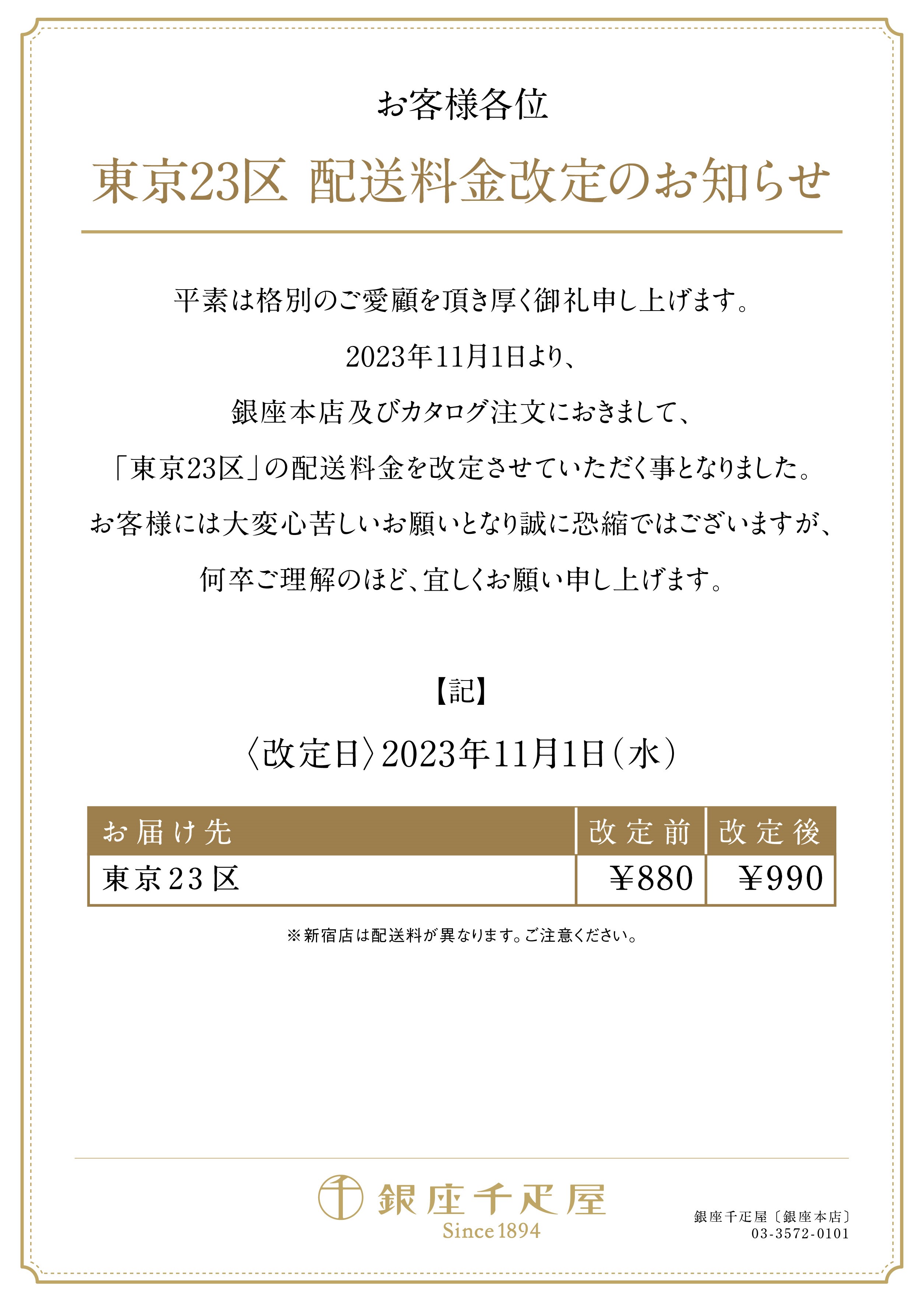 さてこのたび、2023年11月1日(水)より、銀座本店及びカタログ注文におきまして、下記の通り、東京23区の配送料金の改定をさせていただく事となりました。