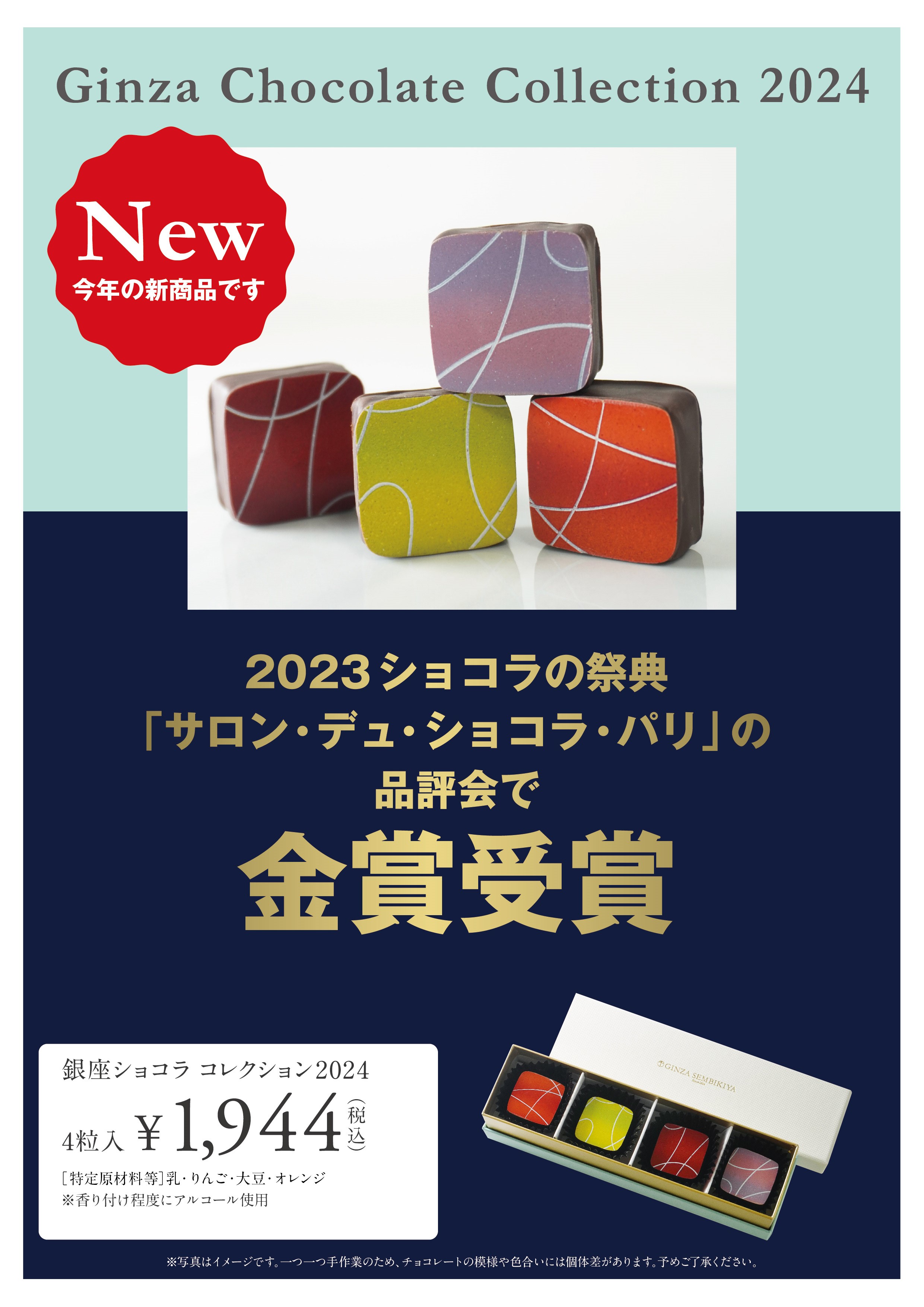 「銀座ショコラコレクション2024」は、2023年フランスで開催されたショコラの祭典「サロン・デュ・ショコラ・パリ」の品評会において、最高位の金賞を受賞いたしました。