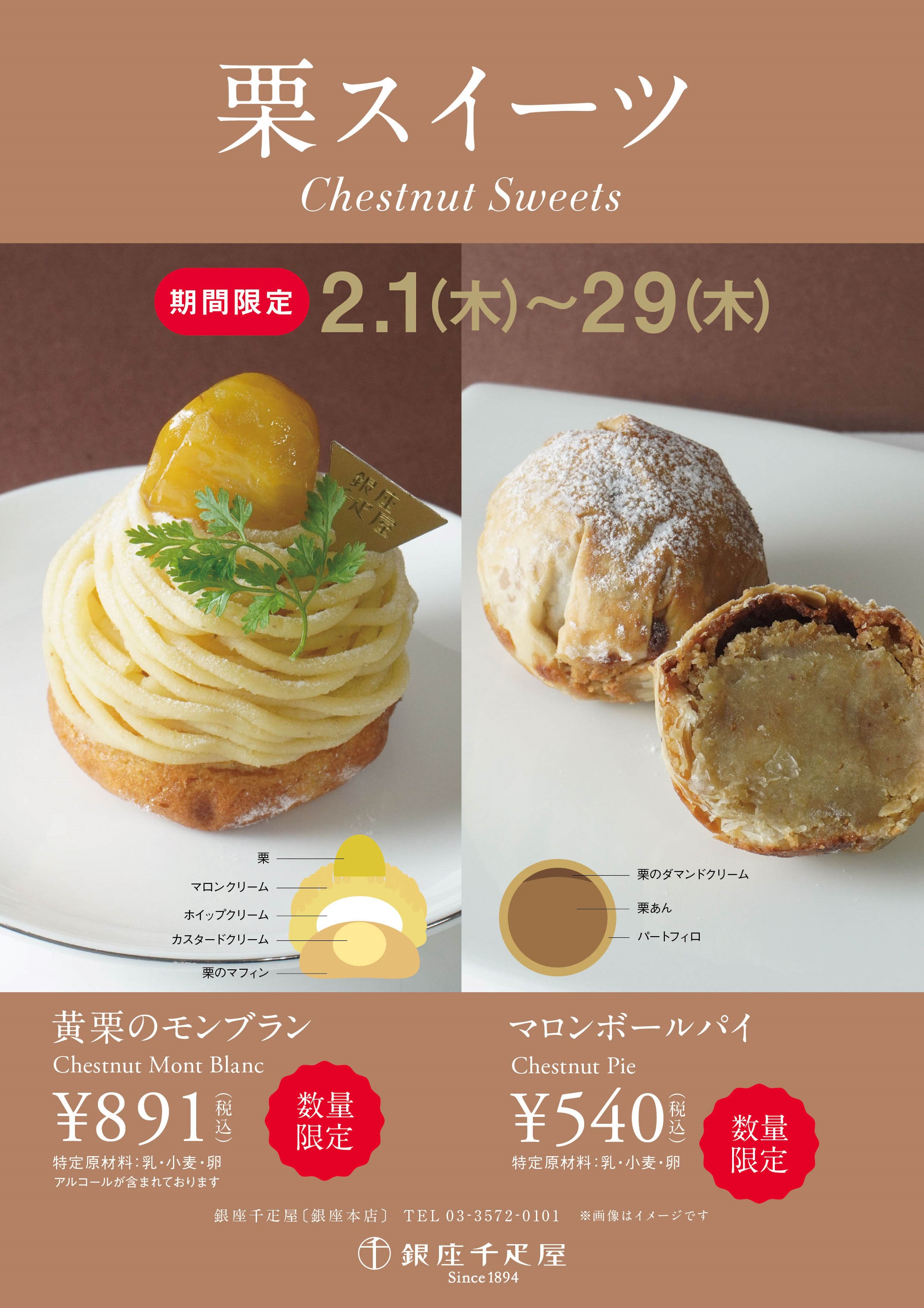 銀座千疋屋・パティスリー銀座千疋屋では、2024年2月1日(木)〜2024年2月29日(木)の期間にて、“栗スイーツフェア”を開催いたします。