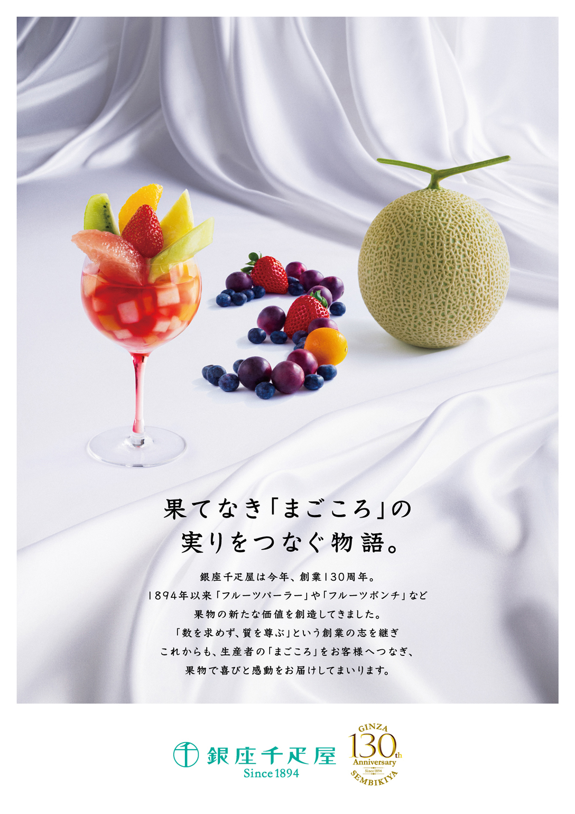銀座千疋屋の代名詞とも言える「マスクメロン」「フルーツポンチ」を用いて130の文字を構成し、130年果物と向き合うゆるぎない姿勢を表現しました。