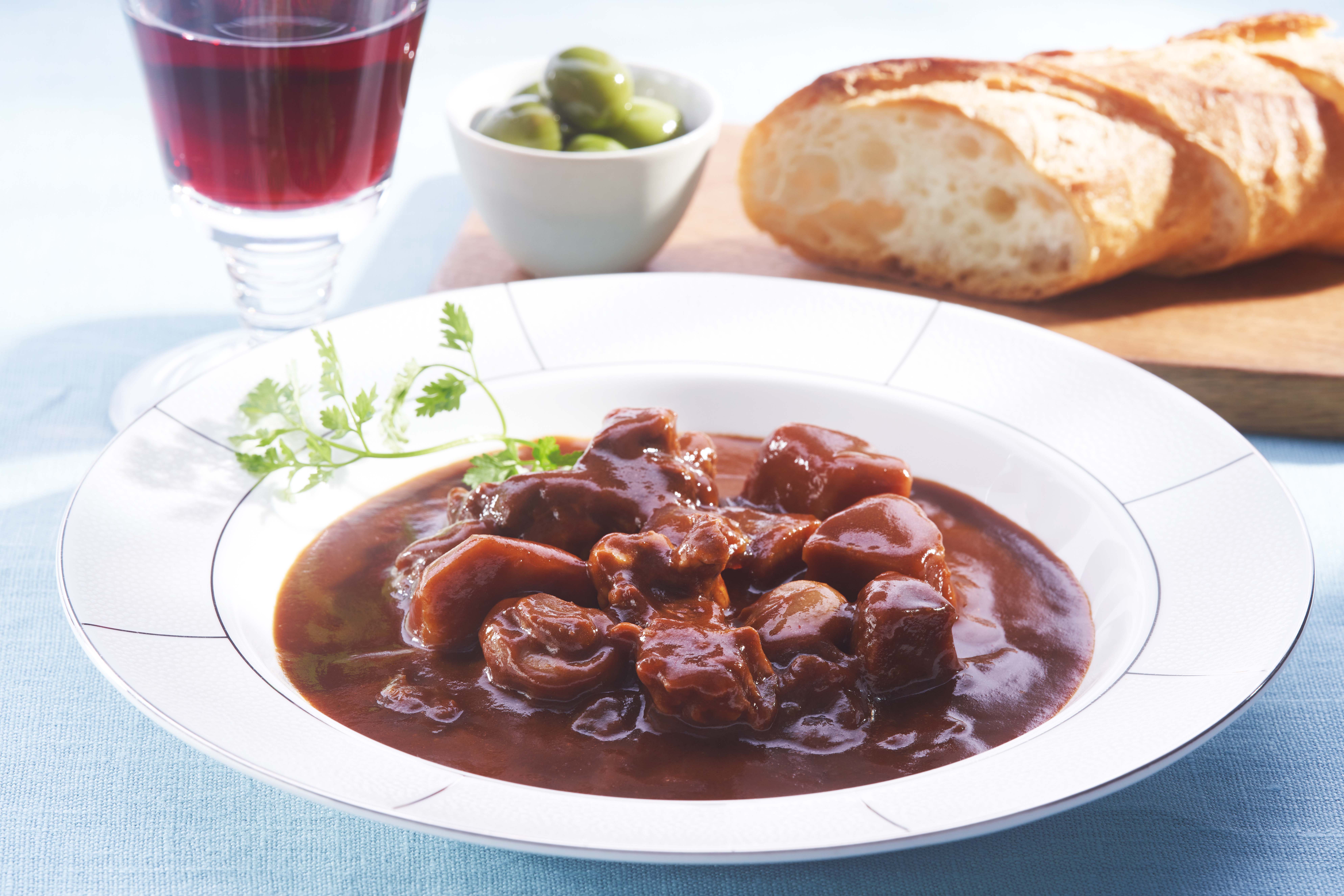 存在感のある牛肉やマッシュルームなどの野菜を、フォン・ド・ヴォ―に赤ワイン、バターなどを加えたコク深いソースで煮込みました。 本格的な味わいをお手軽にお楽しみください。