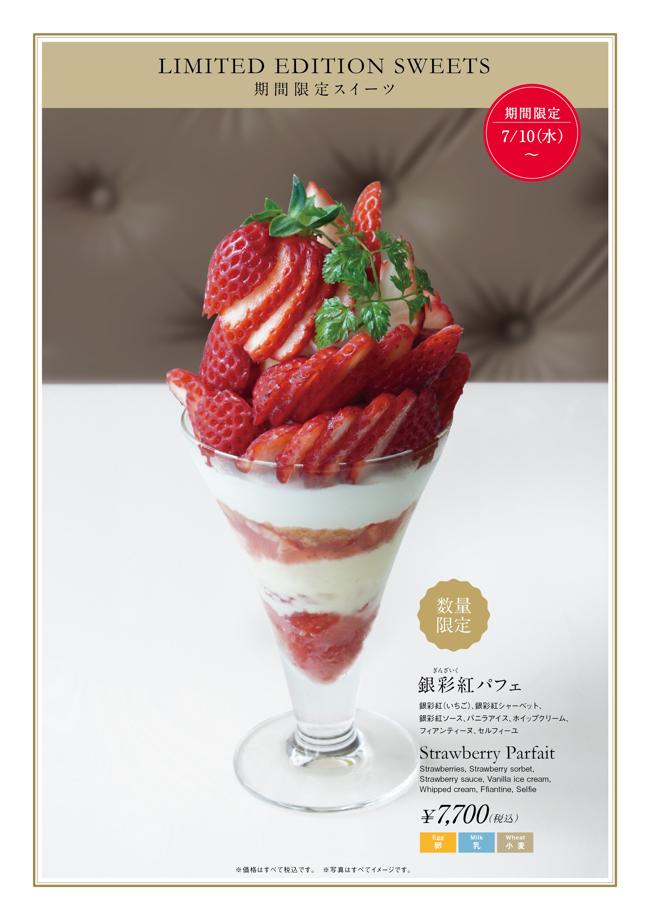 銀彩紅を贅沢に使用したこの時期ならではの夏いちごパフェです。