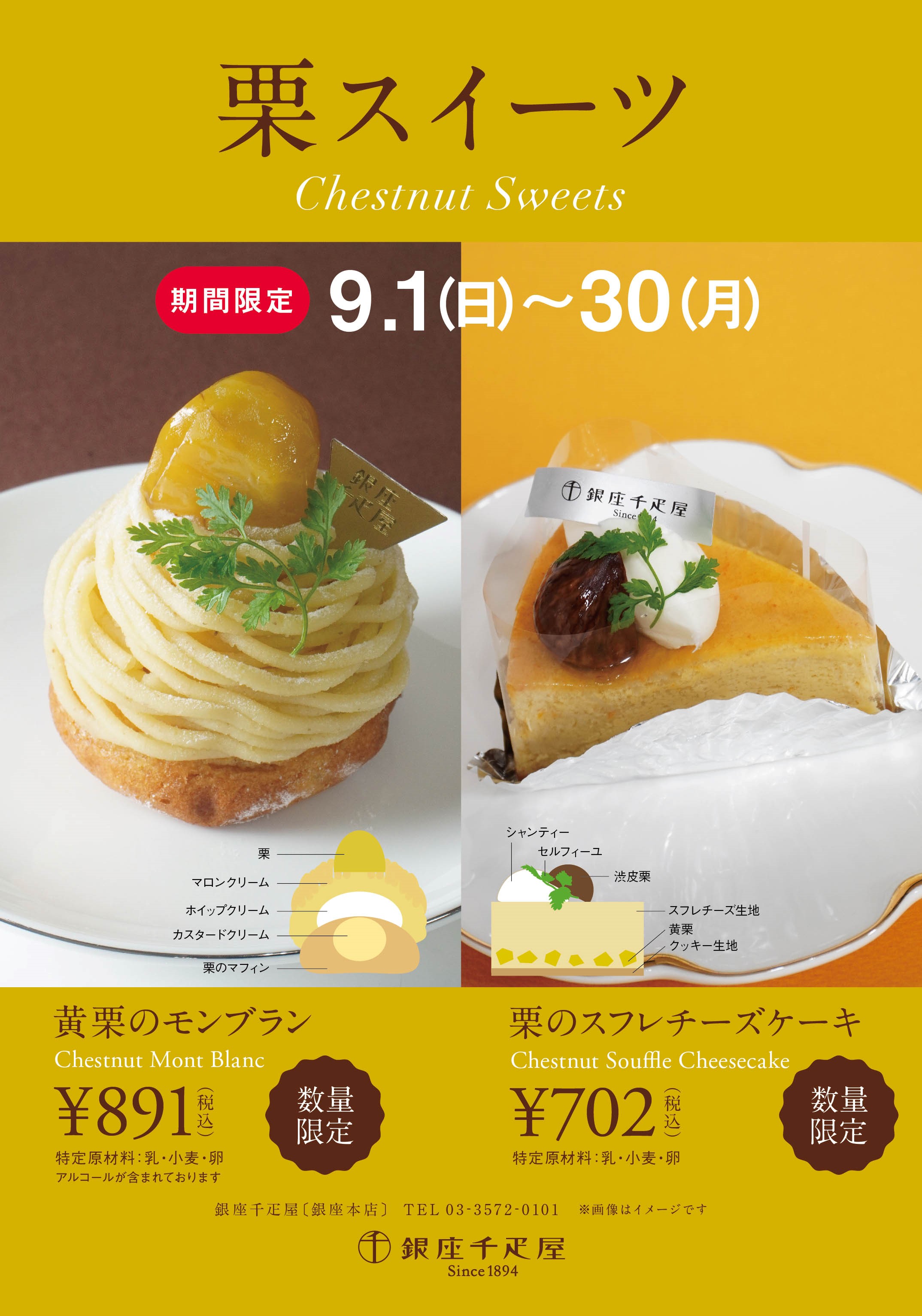 「栗のスフレチーズケーキ」「黄栗のモンブラン」を数量限定でご用意しました。