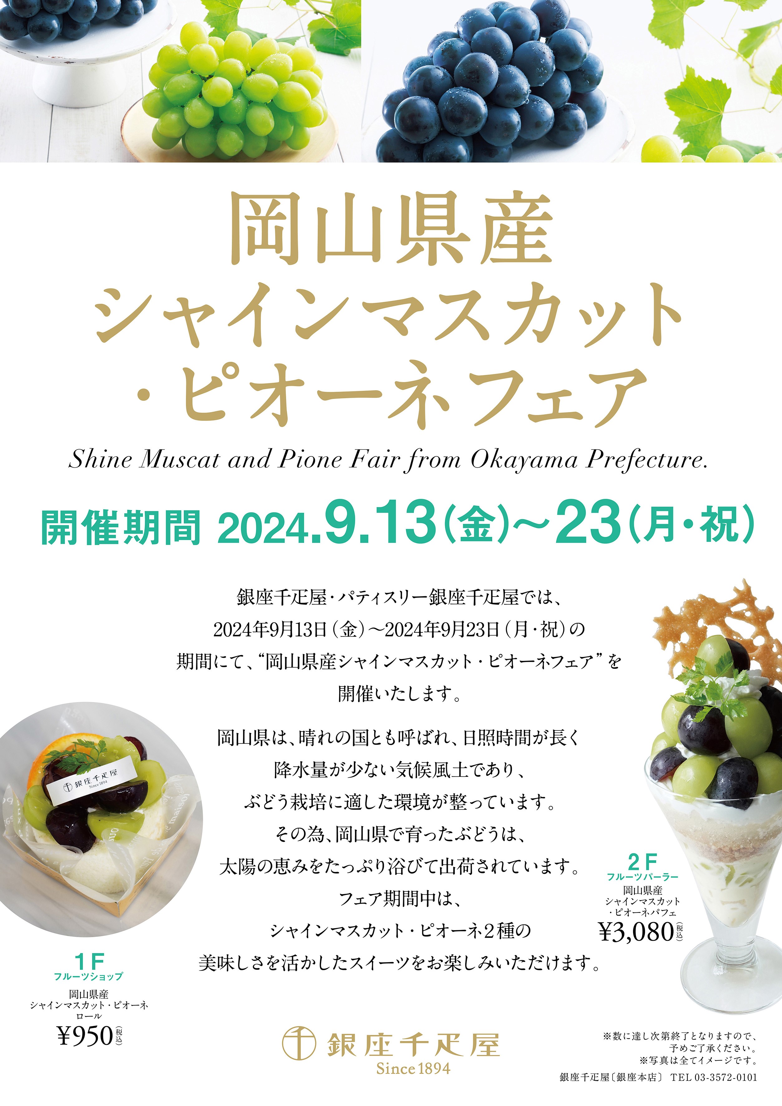 銀座千疋屋・パティスリー銀座千疋屋では、2024年9月13日(金)~2024年9月23日(月・祝)の期間にて、“岡山県産シャインマスカット・ピオーネフェア”を開催いたします。