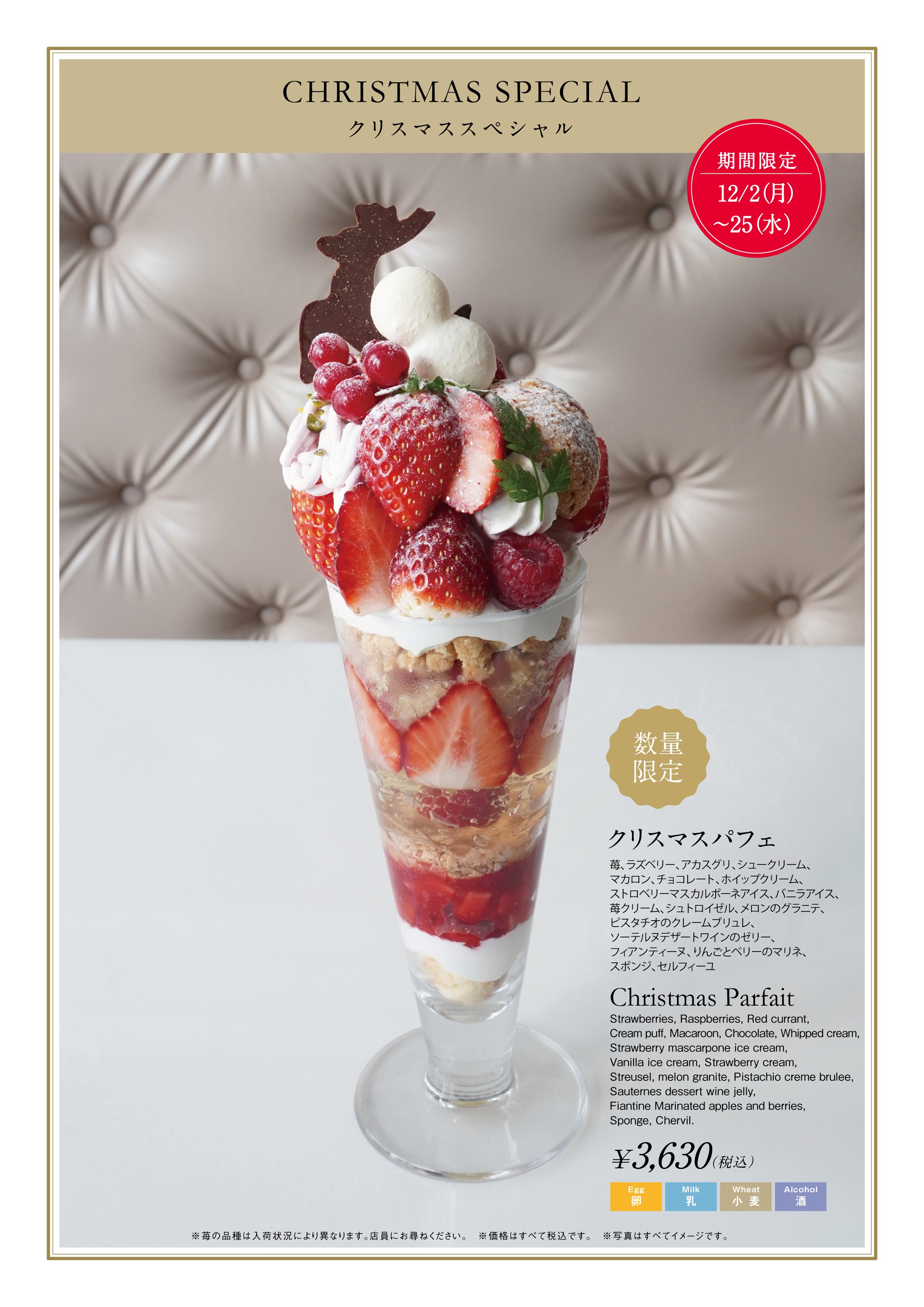 鮮やかに輝く苺が目を惹くクリスマスらしい華やかな限定パフェです。