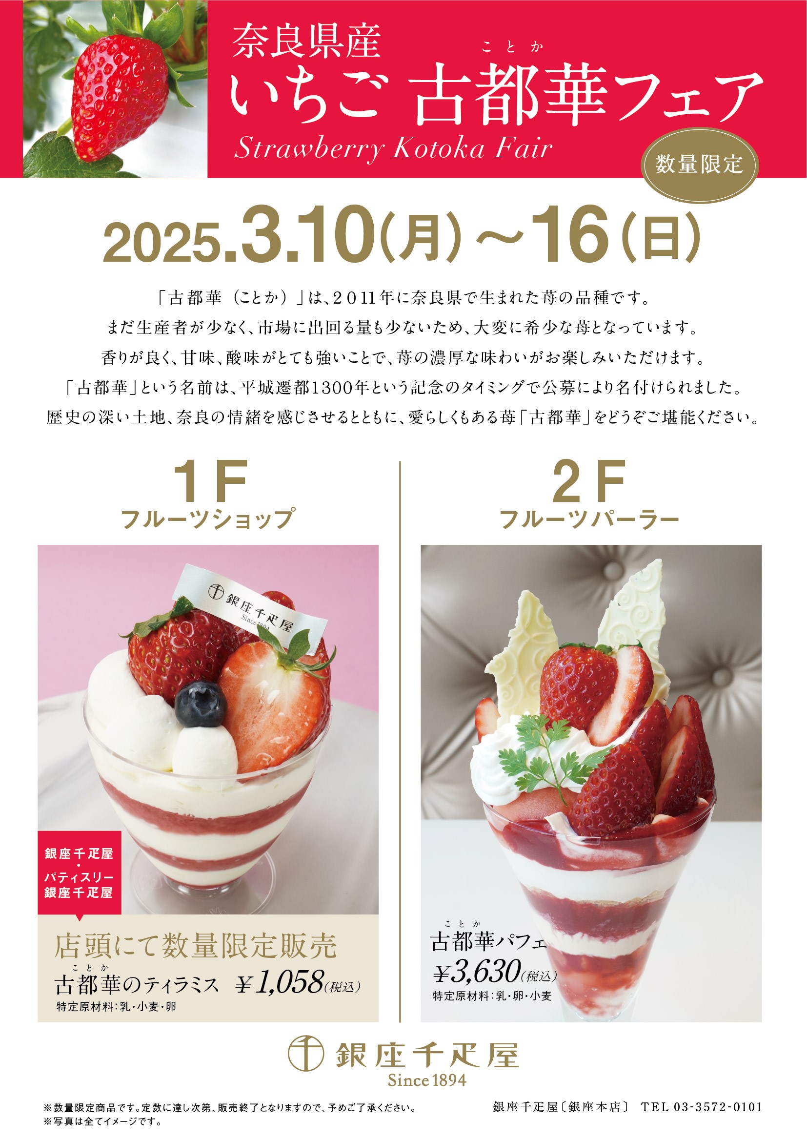 銀座千疋屋・パティスリー銀座千疋屋では、2025年3月10日(月)~2025年3月16日(日)の期間限定にて、“奈良県産いちご古都華フェア”を開催します。