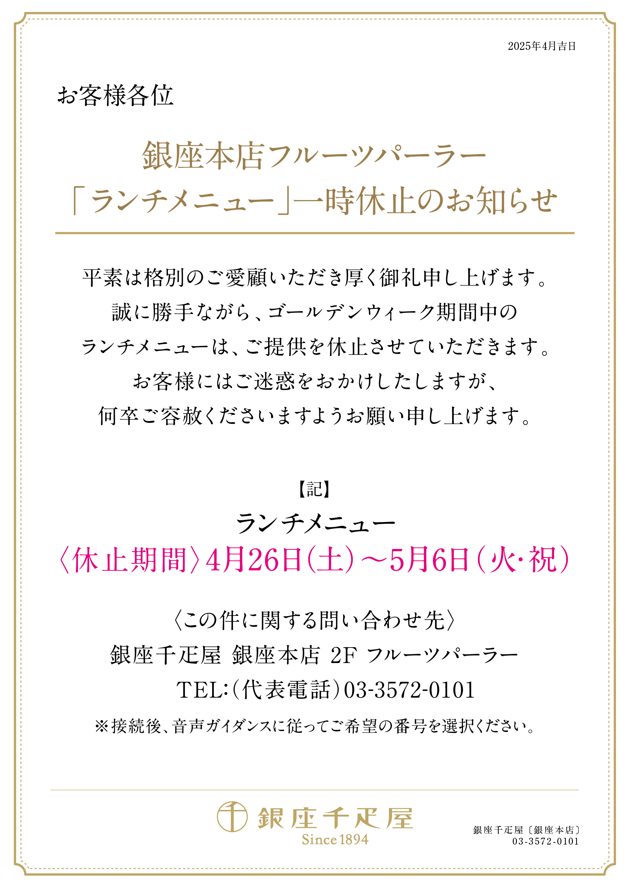≪銀座本店フルーツパーラー≫ 「ランチメニュー」一時休止のお知らせ
