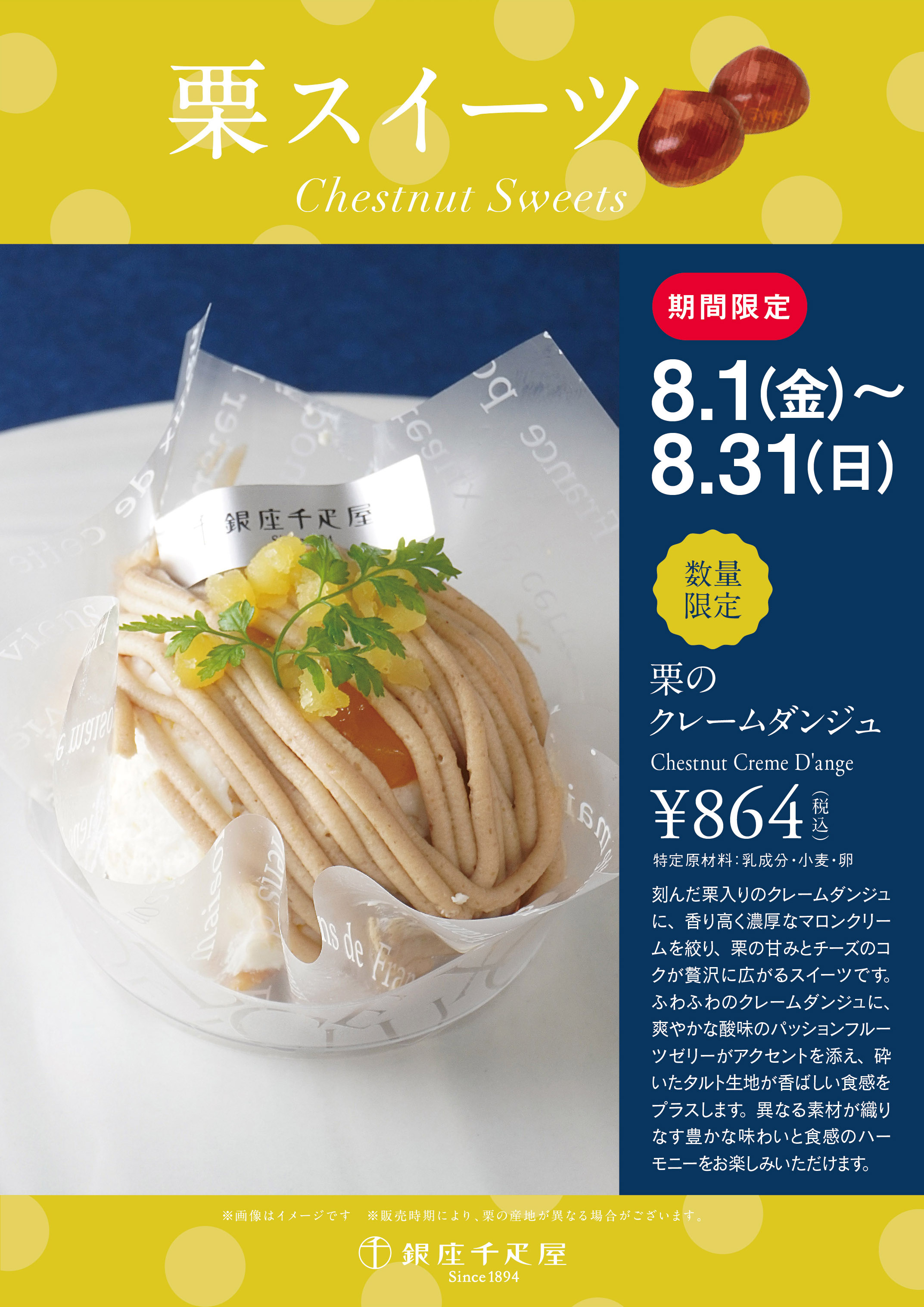 8月は、「栗のクレームダンジュ」を数量限定でご用意しました。