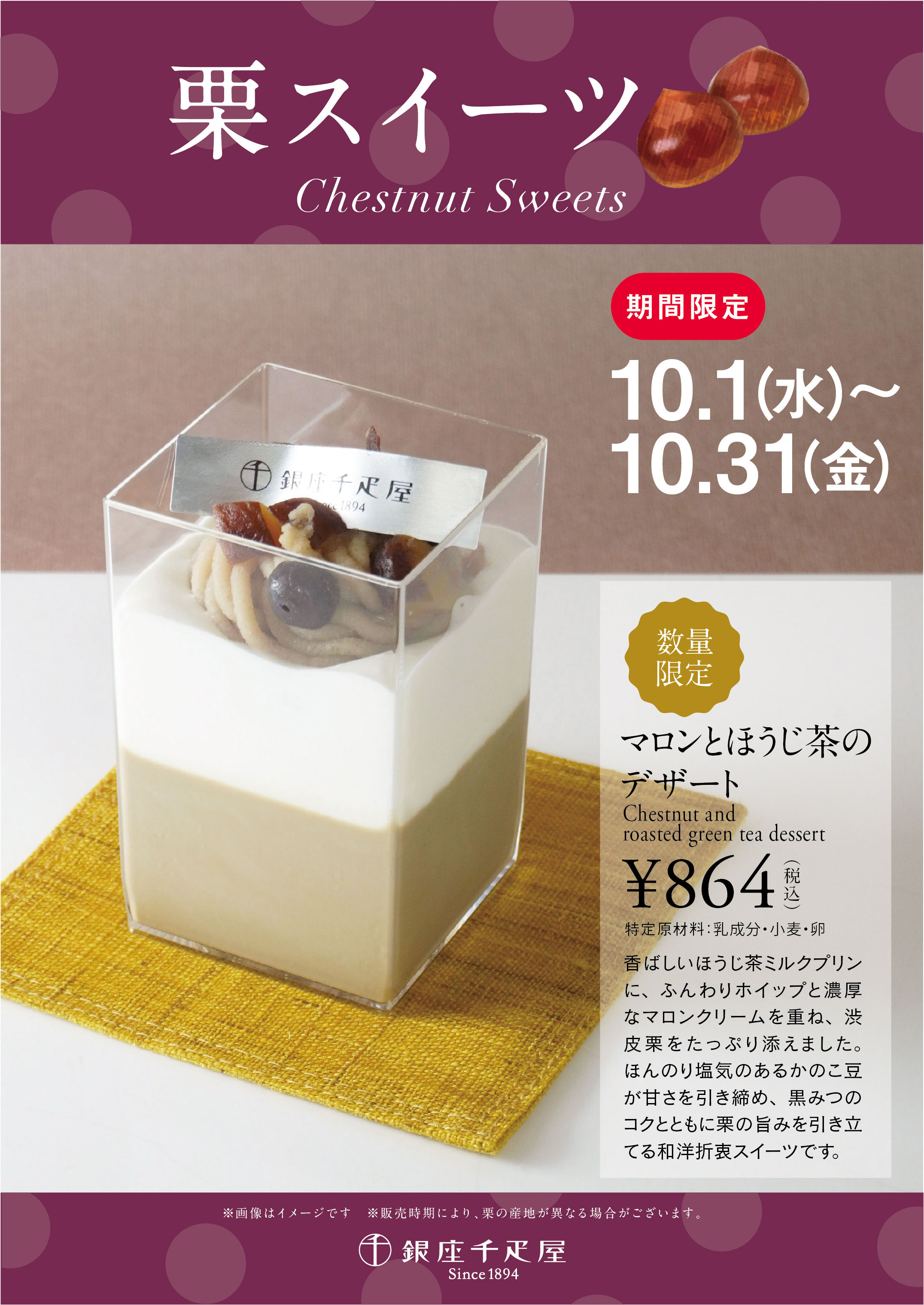 銀座千疋屋・パティスリー銀座千疋屋では、2025年10月1日(水)~10月31日(金)の期間にて、栗スイーツ「マロンとほうじ茶のデザート」を数量限定で発売します。