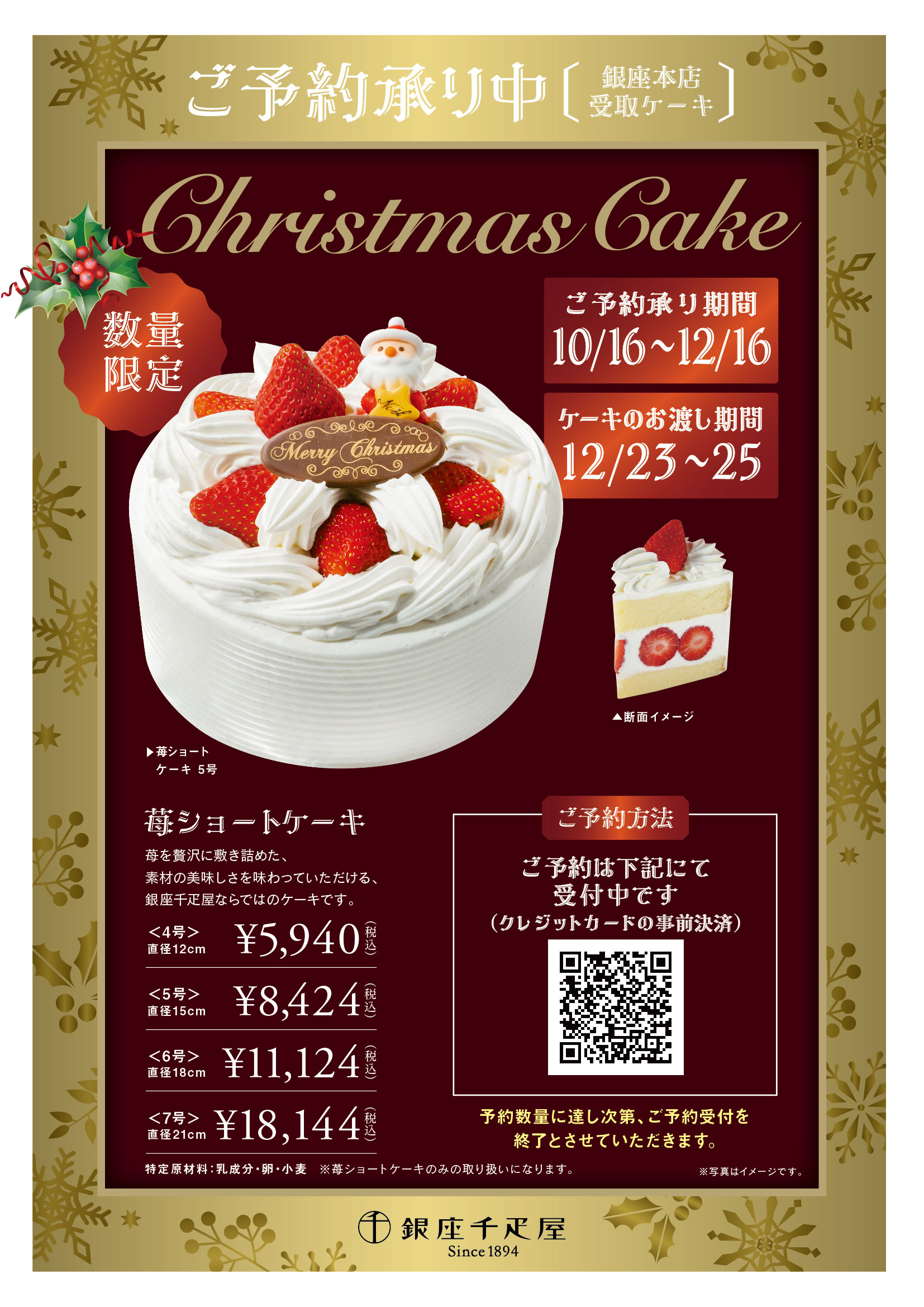 銀座千疋屋・パティスリー銀座千疋屋では、2025年10月16日(木)より、店頭受取りの「クリスマスケーキ」のご予約を承ります。