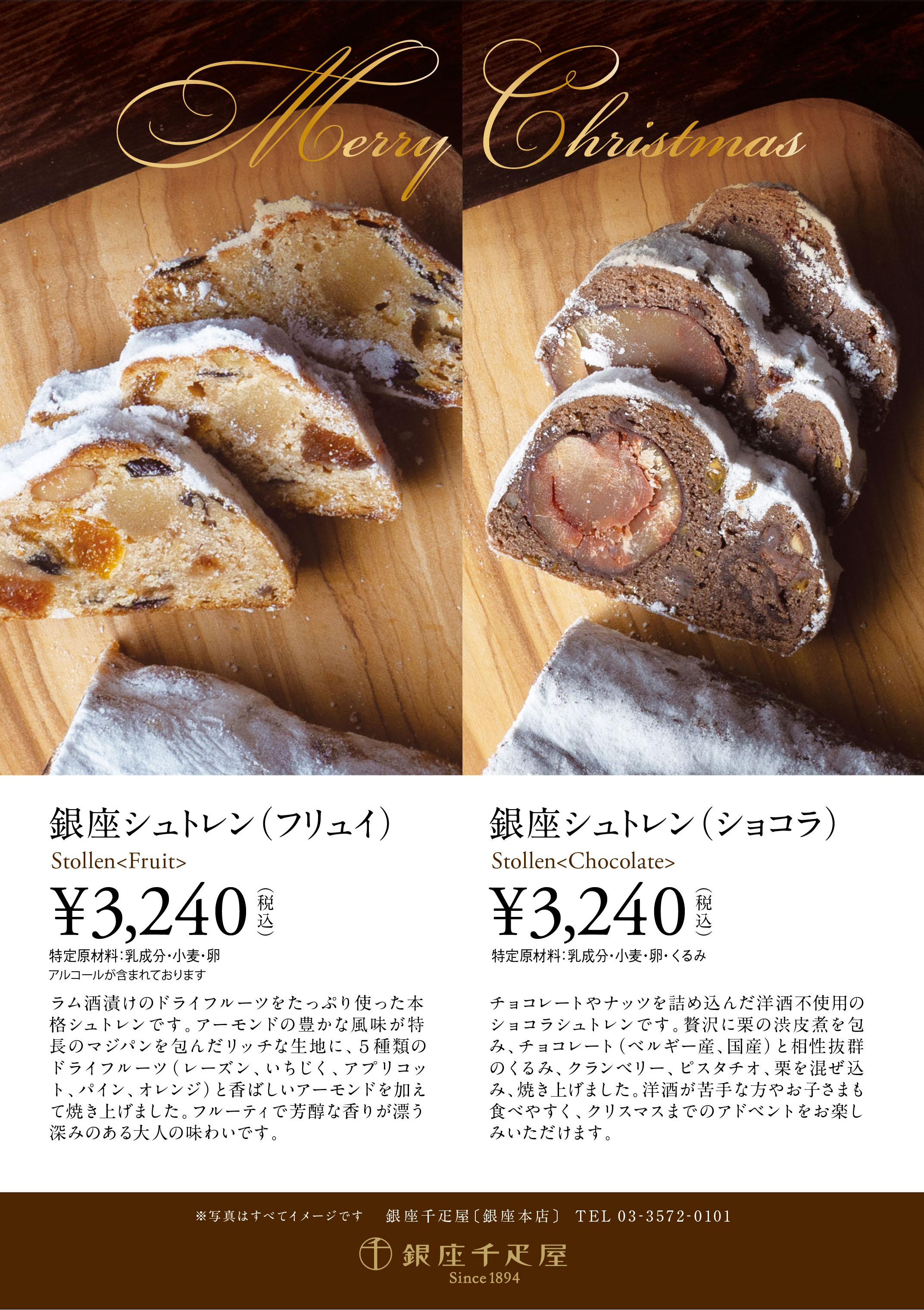 銀座千疋屋・パティスリー銀座千疋屋 各店舗では、「銀座シュトレン」2種を期間・数量限定にて販売中です。
