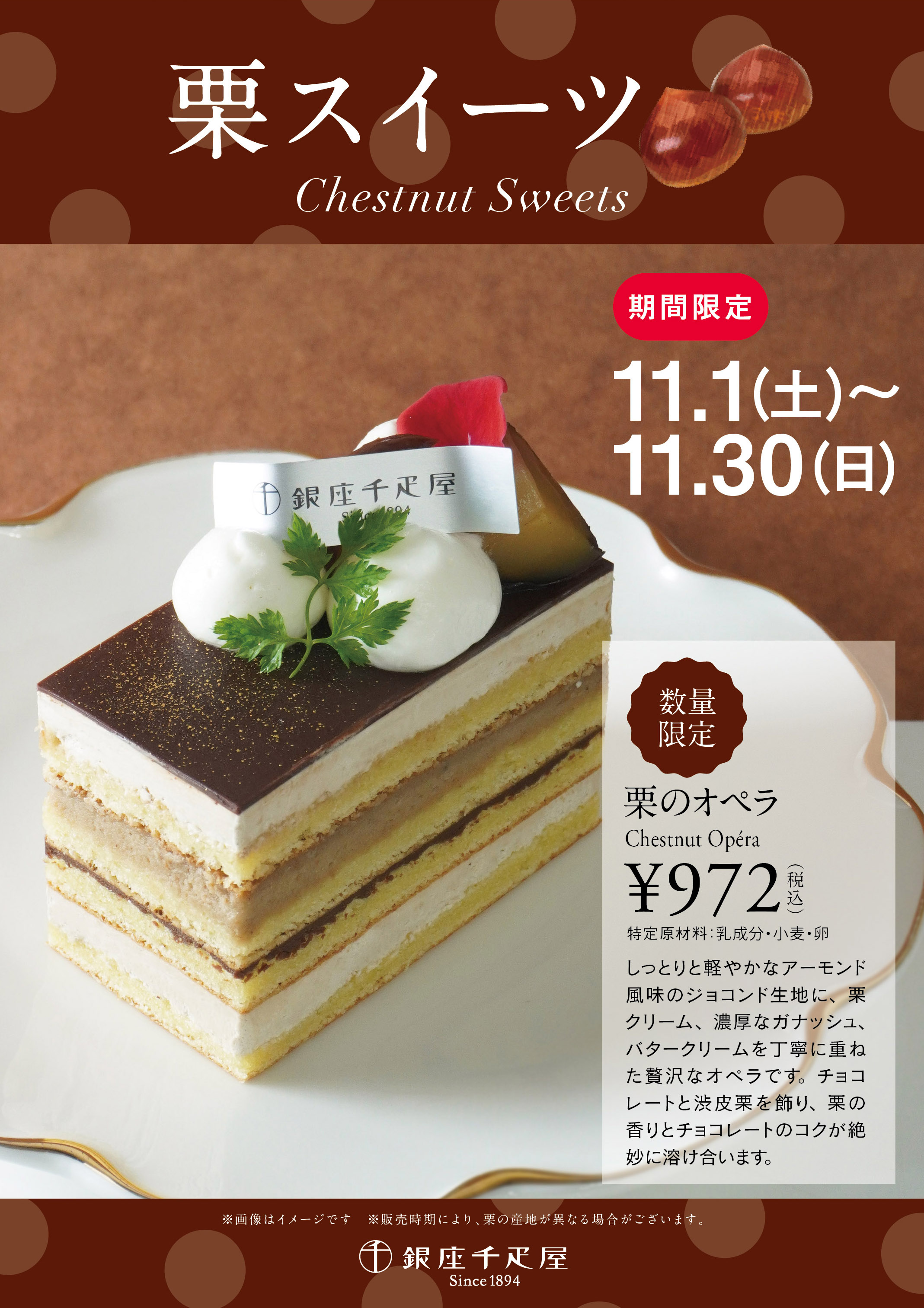 銀座千疋屋・パティスリー銀座千疋屋では、2025年11月1日(土)〜11月30日(日)の期間にて、栗スイーツ「栗のオペラ」を数量限定で発売します。栗とチョコレートで楽しむ秋の贅沢をぜひご堪能ください。