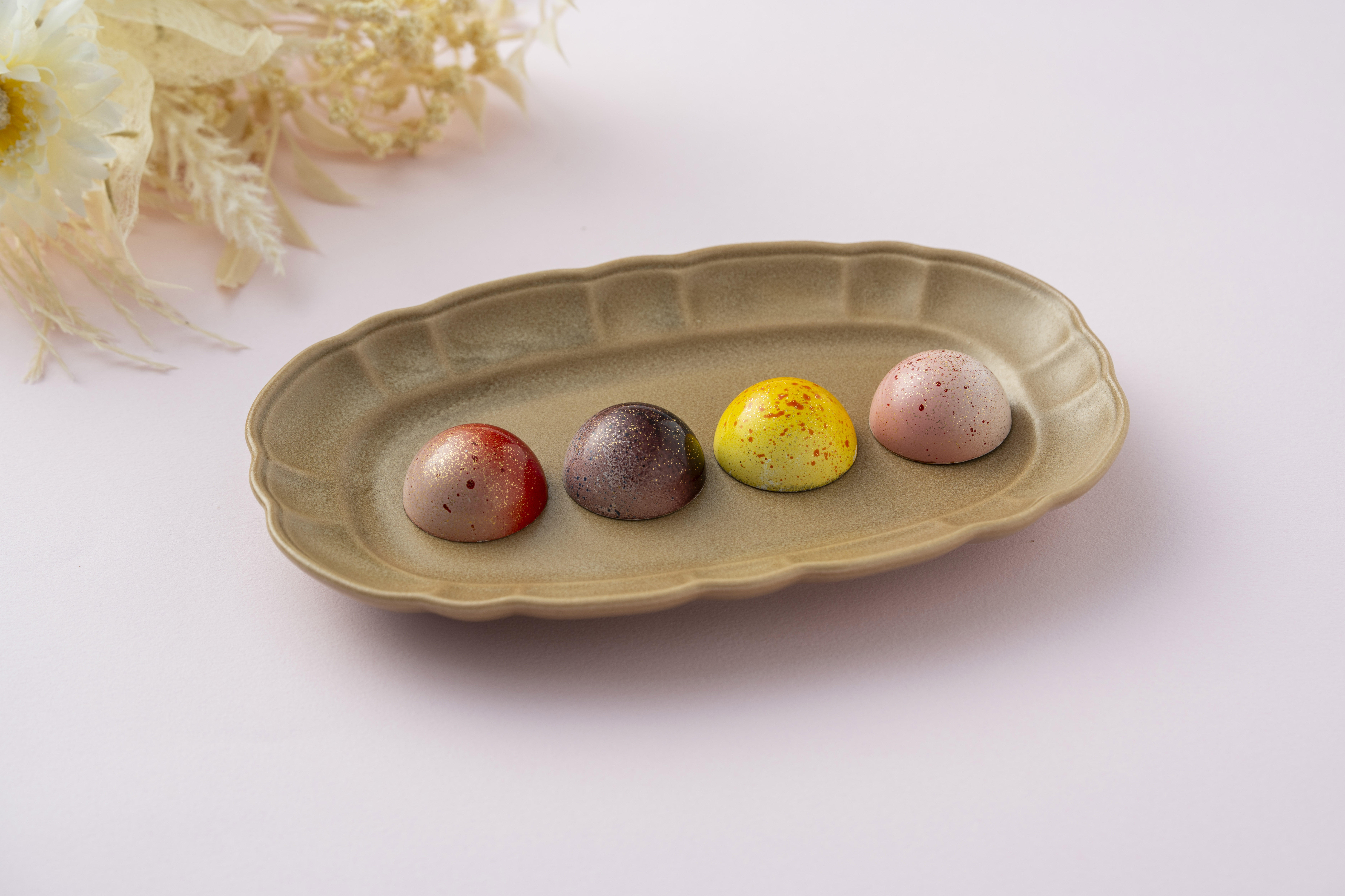 果実のみずみずしさと花の香りを重ねた、4つのガナッシュは、パステルカラーで彩られ見た目も愛らしく、目でも楽しめます。