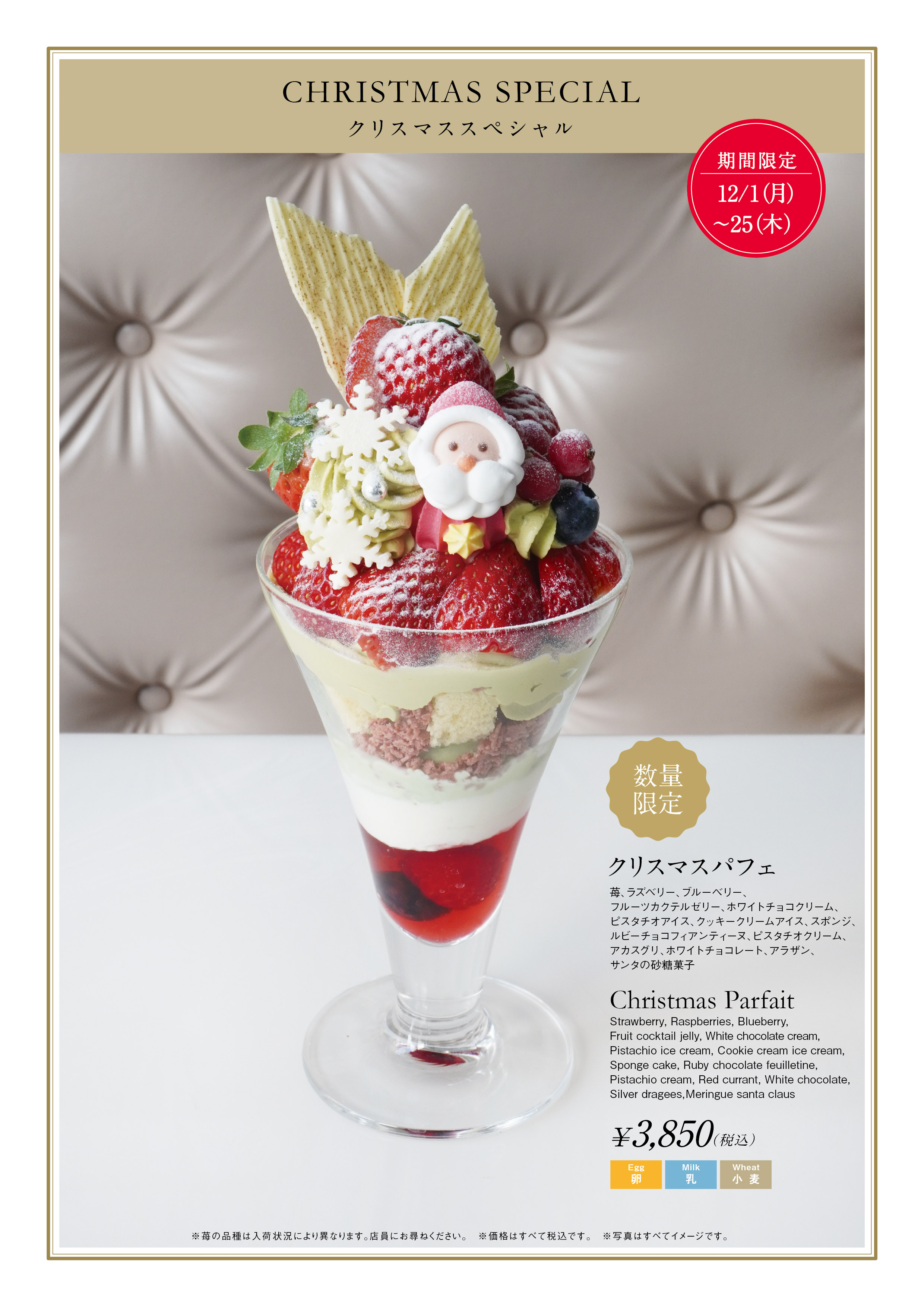 銀座本店フルーツパーラーでは、2025年12月1日(月)~2025年12月25日(木)の期間において“クリスマスパフェ”を期間・数量限定にて発売いたします。