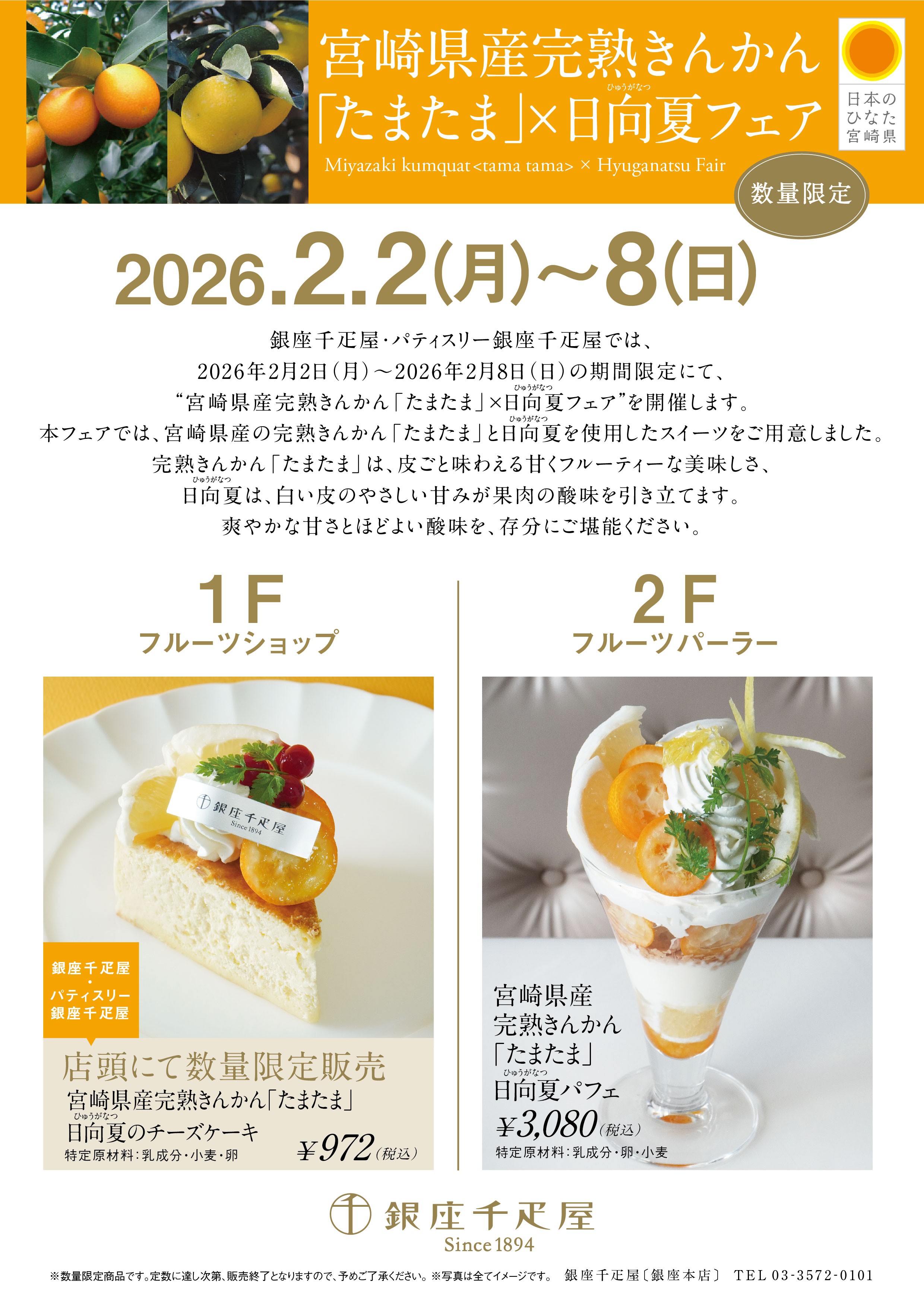 銀座千疋屋・パティスリー銀座千疋屋では、2026年2月2日(月)〜2026年2月8日(日)の期間限定にて、“宮崎県産完熟きんかん「たまたま」×日向夏フェア“を開催します。