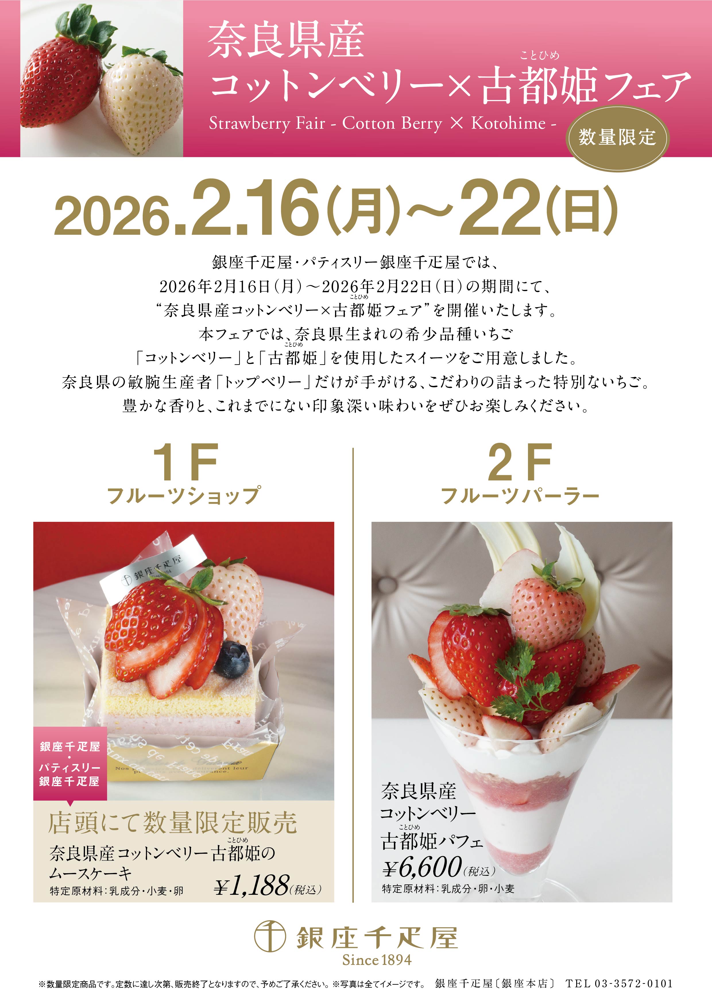 銀座千疋屋・パティスリー銀座千疋屋では、2026年2月16日(月)〜2026年2月22日(日)の期間にて、“奈良県産コットンベリー×古都姫フェア”を開催いたします。