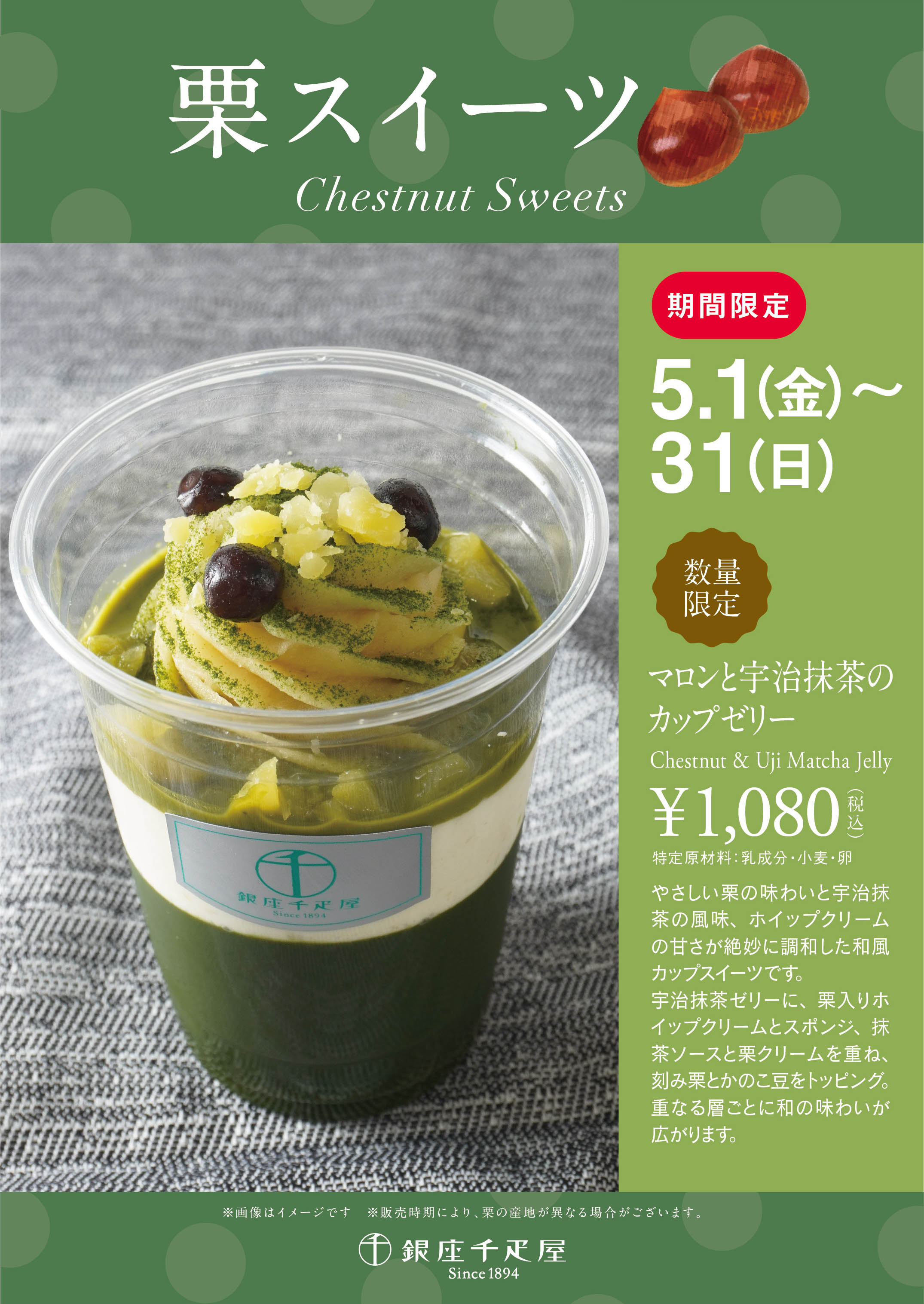 銀座千疋屋・パティスリー銀座千疋屋では、2026年5月1日(金)〜5月31日(日)の期間にて、栗スイーツ「マロンと宇治抹茶のカップゼリー」を数量限定で発売します。栗のまろやかな甘みと宇治抹茶の奥深いほろ苦さをぜひご堪能ください。
